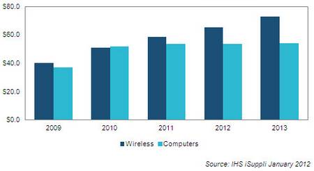 о данным IHS iSuppli, в 2011 г. расходы крупнейших в мире ОЕМ-производителей оборудования на реализацию беспроводной связи превысили все затраты, так или иначе сопряженные с полупроводниками, и составили 58,6 млрд долл., что на 14,5% выше по сравнению с показателем 2010 г.