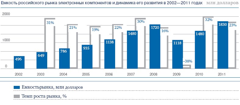опубликованном отчете Минпромторга об итогах деятельности приведены данные о динамике развития российского рынка электронных компонентов с 2002 г. Как следует из документа, в 2011 г. его объем вырос на 23% и достиг $1,83 млрд. В 2002 г., по данным чиновников, объем рынка электронных компонентов не превышал $496 млн.