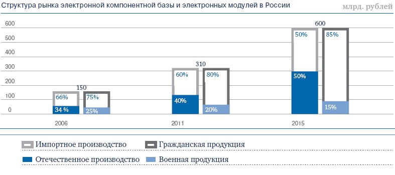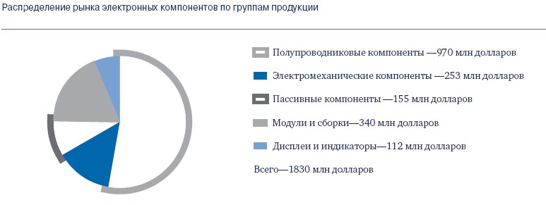 Доля компонентов отечественного производства на рынке в России, по данным Минпромторга, за 2006-2011 гг. достигла 40% (рост с 2006 по 2011 гг. составил 6%). В 2015 г. чиновники рассчитывают нарастить ее до 50%. Около 80% электронных компонентов в России сейчас используются в гражданской продукции, говорится в отчете Минпромторга. 53% поставленных в 2011 г. электронных компонентов пришлось на полупроводники, что соответствует общемировым тенденциям. Что касается распределения компонентов по отраслям потребителей, крупнейшим из них стали производители оборудования связи - около 24%. На промышленную электронику пришлось около 19% электронных компонентов, на военную технику – 18% компонентов, на потребительскую электронику – всего 6%.