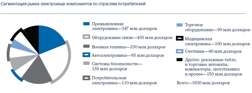 По данным Минпромторга, все эти годы рынок демонстрировал существенные темпы роста, иногда превышавшие 30%, за исключением кризисного 2009 г., когда он «просел» на 38%, с $1,72 млрд до $1,12 млрд. В 2010 г. были зафиксированы самые высокие темпы роста – 32%. В тот год объем рынка достиг 1,48 млрд. По данным аналитической компании MarketLine, мировой рынок электронных компонентов и полупроводников в 2010 г. составлял $430 млрд. Таким образом, доля России на нем составляла менее 0,5%. По оценкам аналитиков из Hoovers, на долю США тогда же пришлось порядка $100 млрд.