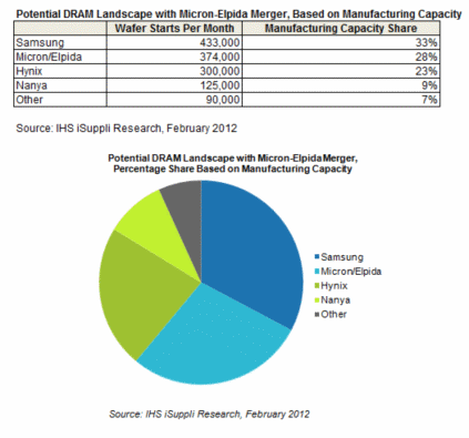 оследние недели муссируются слухи о том, что Micron ведет переговоры об инвестировании или приобретении компании Elpida, которая уже пять кварталов подряд терпит убытки и увязает в долгах. Ни одна из компаний пока официально не признала, что эти переговоры ведутся. По данным IHS, ежемесячная мощность совместного производства Micron и Elpida составила бы 374 тыс. DRAM-пластин, или 28% от мирового производства DRAM-памяти. Следует заметить, что на долю Samsung здесь приходятся 33% (см. рис.).