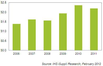 ыручка в 2011 г. в сегменте СнК (систем-на-кристалле, SoC) для телевизоров составила 2,19 млрд долл., что на 7,4% меньше по сравнению с 2010 г. Этот сегмент испытывал непрерывный рост, за исключением короткого периода, предшествовавшего экономической рецессии. Так, например, в 2010 г. объем продаж СнК для ТВ увеличился на 22% по отношению к 2009 г. (см. диаграмму).