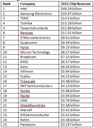 Список первых 25 поставщиков полупроводников по уровню доходов за 2011 г.