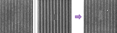 Линии из полистерола шириной 14 нм и расстоянием 28 нм, изготовленные методом DSA, после удаления РММА (слева) и демонстрация возможности устранения пробела в трафарете 200 нм (справа) Источник: imec