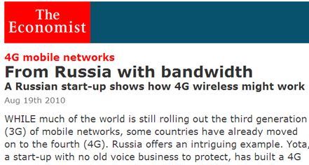 26 августа The Economist: Российская компания-стартап демонстрирует возможности беспроводных сетей 4GВлиятельный еженедельный журнал The Economist, издающийся в Великобритании, опубликовал материал о российской компании Yota, называя ее амбициозной и нетипичной для российского рынка. Ниже – перевод редакционной статьи.
