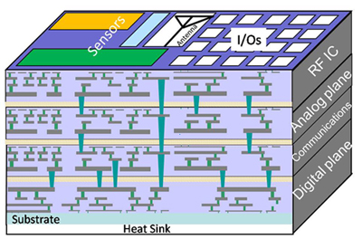Схематическое представление гетерогенной 3D-микросхемы Однако тестирование изделий, изготовленных с помощью технологий 2,5D и 3D, требует новых тестовых функций и методов. В первую очередь, речь идет о системе ввода-вывода, логических межсоединениях и соединениях между логикой и памятью.
