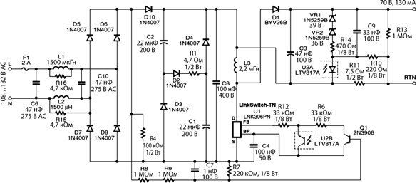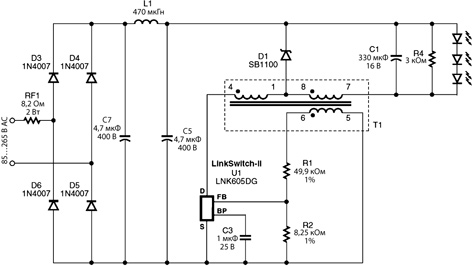 а рынке устройств освещения происходят большие изменения. Сегодня многих интересуют пути замены стандартных 60 Вт ламп накаливания на более энергоэффективные решения с использованием светодиодов. Это обусловлено известными и объективными факторами: КПД светодиодов в 10 раз больше, чем у ламп накаливания, время работы светодиодов — около 100 тыс. ч. — фактически не предполагает дальнейших затрат на замену и обслуживание осветительного оборудования. Потенциал светодиодного освещения очевиден. Так, в США уже переходят на использование светодиодных светильников во всех правительственных зданиях. Серьезность намерений США подтверждается тем фактом, что для скорейшего развития данной отрасли Конгресс назначил премию в 10 млн долл. за создание альтернативы лампе накаливания под стандартный патрон. Однако новая лампа должна содержать не только светодиоды, но и светодиодный драйвер (источник питания), что ставит перед разработчиками довольно непростую задачу, учитывая жесткие ограничения по габаритам и шумовым характеристикам. Эффективность лампы должна превышать 90 лм/Вт, поэтому эффективность источника питания критична для создания успешного решения. Чтобы обеспечить распространение света, светодиодная лампа должна содержать 12 или более светодиодов. Яркость светодиода является функцией от проходящего через него тока, типовое номинальное напряжение светодиода — 3,4 В с диапазоном 2,8…4,2 В. Светодиоды в лампе соединены последовательно, т.е. драйвер должен обладать функцией работы на постоянном токе (СС — Constant Current) в широком диапазоне напряжений. Недавний прорыв в технологии производства преобразователей напряжения позволил строить светодиодные драйверы при использовании минимального числа компонентов. К примеру, преобразователь, разработанный компанией Power Integrations Inc. (см. рис.1), использует всего 16 компонентов. Данная схема спроектирована для работы в диапазоне входных напряжений 85...265 В АС, что предоставляет возможность использования лампы в любой стране мира.