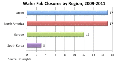 Между тем, 5 из 49 закрытых фабрик работали с современными 300-мм пластинами. Первой 300-мм фабрикой, прекратившей коммерческую деятельность, стало производство компании Qimonda, которая обанкротилась в начале 2009 г. Это было единственное 300-мм производство в Северной Америке, закрытое за указанный период. Согласно данным отчета IC Insights, региональное соотношение между закрытыми фабриками в течение 2009–2011 гг. оказалось следующим: на долю Японии и Северной Америки пришлось 17 фабрик, 12 фабрик закрылось в Европе и три – в Южной Корее. Одной из закрытых японских фабрик оказалось 300-мм производство Sony, однако оно закрылось на модернизацию для последующего изготовления датчиков изображения. Тремя 100-мм фабриками, закрытыми за прошедшие три года, стали производства компаний Dalsa Semiconductor Inc. в Канаде, ON Semiconductor в Словацкой республике и Diodes в Великобритании (см. диаграмму).