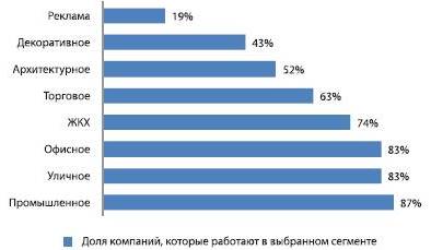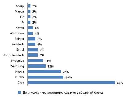 Специализация компаний по сегментам рынка Исследование показало, что самыми популярными сегментами освещения на сегодня считают промышленное, уличное и офисное освещение (см. рис.). Далее следует освещение ЖКХ, торговое, архитектурное, декоративное и рекламное. Заметный рост произошел в сегментах светодиодного уличного и промышленного освещения. В прошлом году большинство компаний могли предложить офисные светильники и лишь некоторые предлагали решения в области уличного и промышленного освещения. Сегодня такие светильники есть у большинства компаний. Можно также отметить рост интереса в области светодиодного торгового освещения. Около 46% компаний, которые занимаются преимущественно светодиодной продукцией, имеют в своих линейках решения для торгового освещения. Опрос, касающийся светодиодов, используемых в производимой или поставляемой продукции, выявил явного лидера. Почти 63% компаний из числа опрошенных используют светодиоды Cree. Далее идут светодиоды Osram и Nichia, которые занимают примерно равные доли 26% и 24% соответственно (см. рис.).